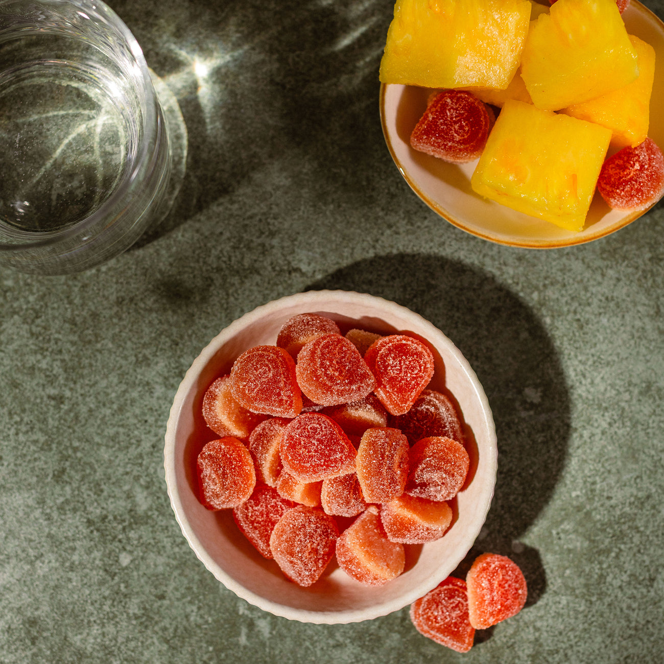 Sugar, Corn Syrup, Water, Unflavored Gelatin, Inulin Fructooligosaccharide, Organic Safflower Oil, Organic Broad Spectrum Hemp Extract, Caffeine, B-12 (Methyl cobalamin), Fruit Pectin, Natural Orange Flavor, Malic Acid, Organic Beeswax, Vegetable Juice Color, Fruit Juice Color, Lemon Juice, Tartaric Acid