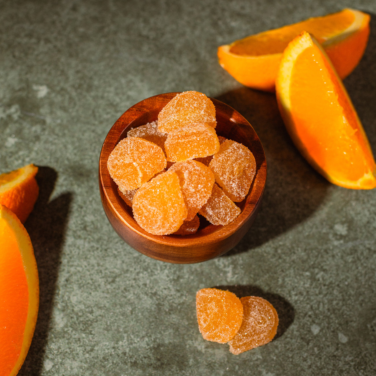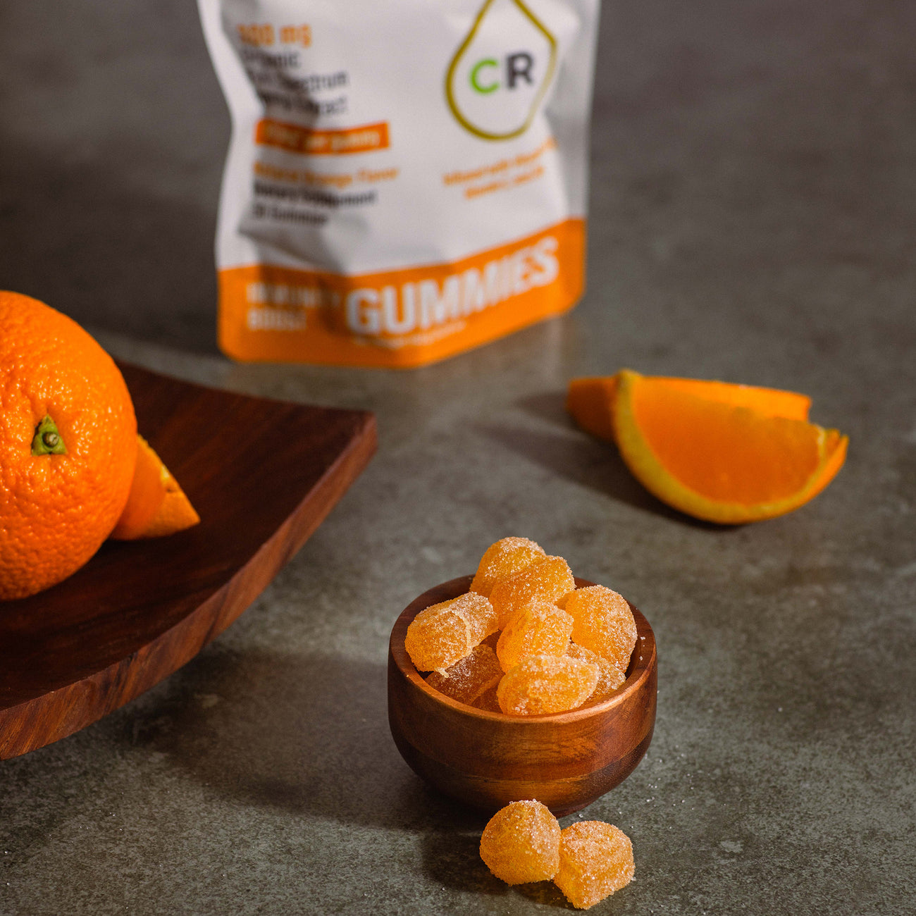 Sugar, Corn syrup, Water, Ascorbic Acid (Vitamin C), Unflavored Gelatin, Inulin Fructooligosaccharide, Organic Safflower Oil, Organic Full Spectrum Hemp Extract, Fruit Pectin, Natural Orange Flavor, Organic Beeswax, Vegetable Juice Color, Fruit Juice Color, Zinc Citrate, Vitamin D3, Lemon Juice, Tartaric Acid